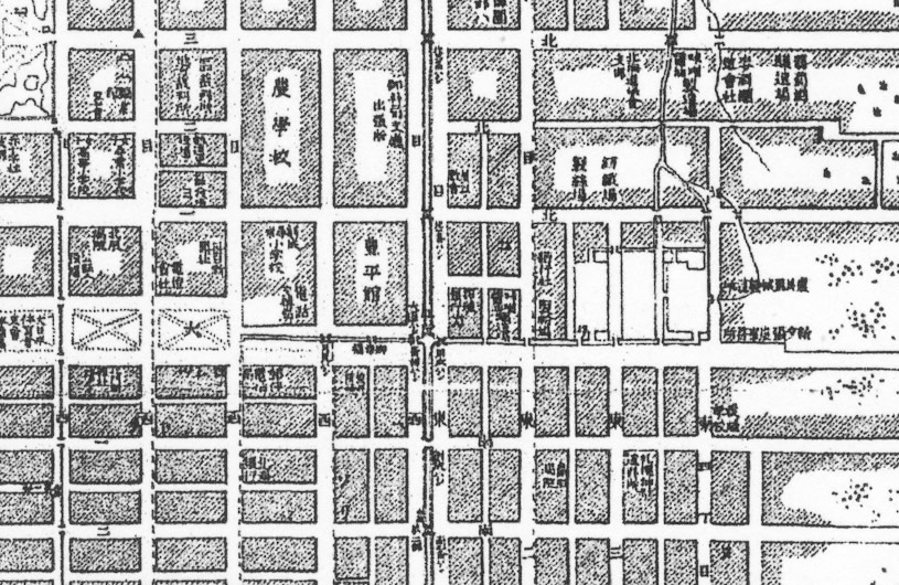 On "The Diagram of Sapporo City" issued in 1901, only the lines between Odori and Kita 2-jo of Higashi 4-chome-dori heading north are slightly out of alignment to the east. The characters, "Farming Tool and Machine Factory" and "Yubari Coal Office" are written in the field and orchard on Higashi 4-chome-dori. Why is this out of line? The answer can be found with the machine factory mentioned in previous article.