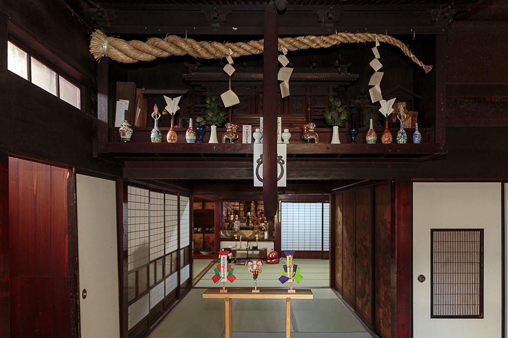 A dirt floor is at the entrance and the living area is on the left. The front room has a sunken hearth made in the floor, where the head of the family is said to have sat. A hexagonal skylight is in the ceiling, protruding through the roof to let in sunlight. In the back room, a Buddhist altar is placed next to the room which faces the yard, and works of art and calligraphy are displayed. Honored guests may have been invited to see this room. As you go upstairs, a sunny bright Japanese-style room opens. The manager and his family may have spent their time in this room.