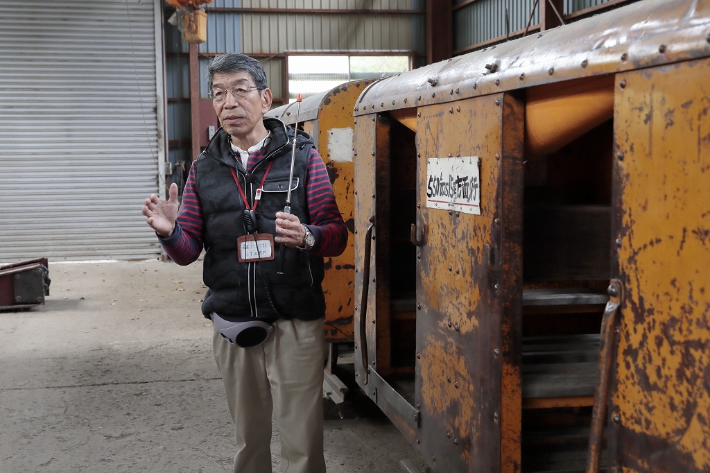 Mr. Mikami Hideo serves as a guide for the Akabira Municipal Coal Mining Heritage Guidance Facility, sharing inspiring stories with visitors. One such story is about the No. 1 Shaft Tower of the former Sumitomo Akabira Coal Mine. This elevator-like facility uses a gigantic pulley to hoist wire which lowers a four-level, box-shaped cage to a depth of 615 meters underground, and also lifts extracted coal back to the surface. Mkami shares his own experiences in this very shaft. “Each level would hold a team of 18 miners. Descending at 12 meters per second, your ears would start to hurt on the way down.” Listening to his riveting tale, you can imagine an invisible wire starting to move, and the rusty cage descending deep into the earth even today.