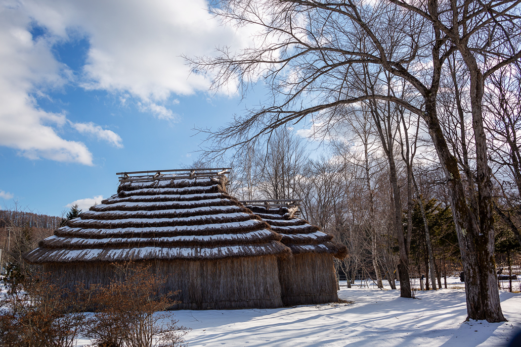 A group of cise built at Nibutani Kotan, where a traditional Ainu settlement has been recreated. The insides of the cise can also be viewed from May to October.