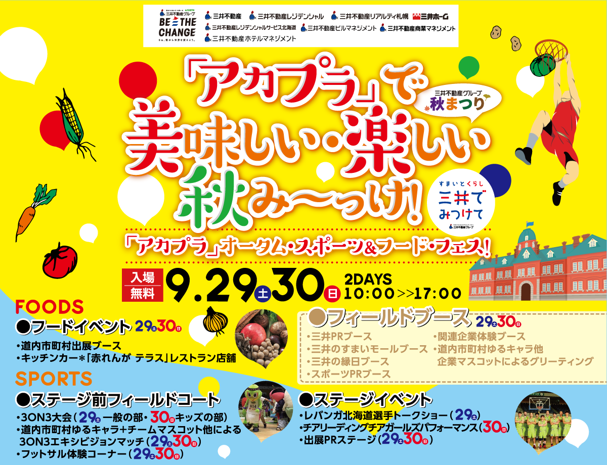 Mitsui Fudosan Co., Ltd. will hold the “Mitsui Fudosan Group Autumn Festival- Akapla Autumn Sports & Food Fest” for a period of two days on Sat., September 29th & Sun., September 30th, when sports- and food-related contents fitting of the autumn season will be prepared at the Sapporo Kita 3-jo Plaza (Akapla) venue. In addition to a talk show by players from B. LEAGUE pro basketball team Levanga Hokkaido, and a 3-on-3 tournament – which will be one of the official disciplines at the 2020 Tokyo Olympics – the event will also feature kitchen cars offering dishes from the restaurants in Akarenga Terrace, as well as a Hokkaido product fare and various festival stalls. The “Mitsui Living Mall” will also be held simultaneously, with specialist booths where consultation about homes will held. Why not take this opportunity to come along to Sapporo Kita 3-jo Plaza (Akapla)?