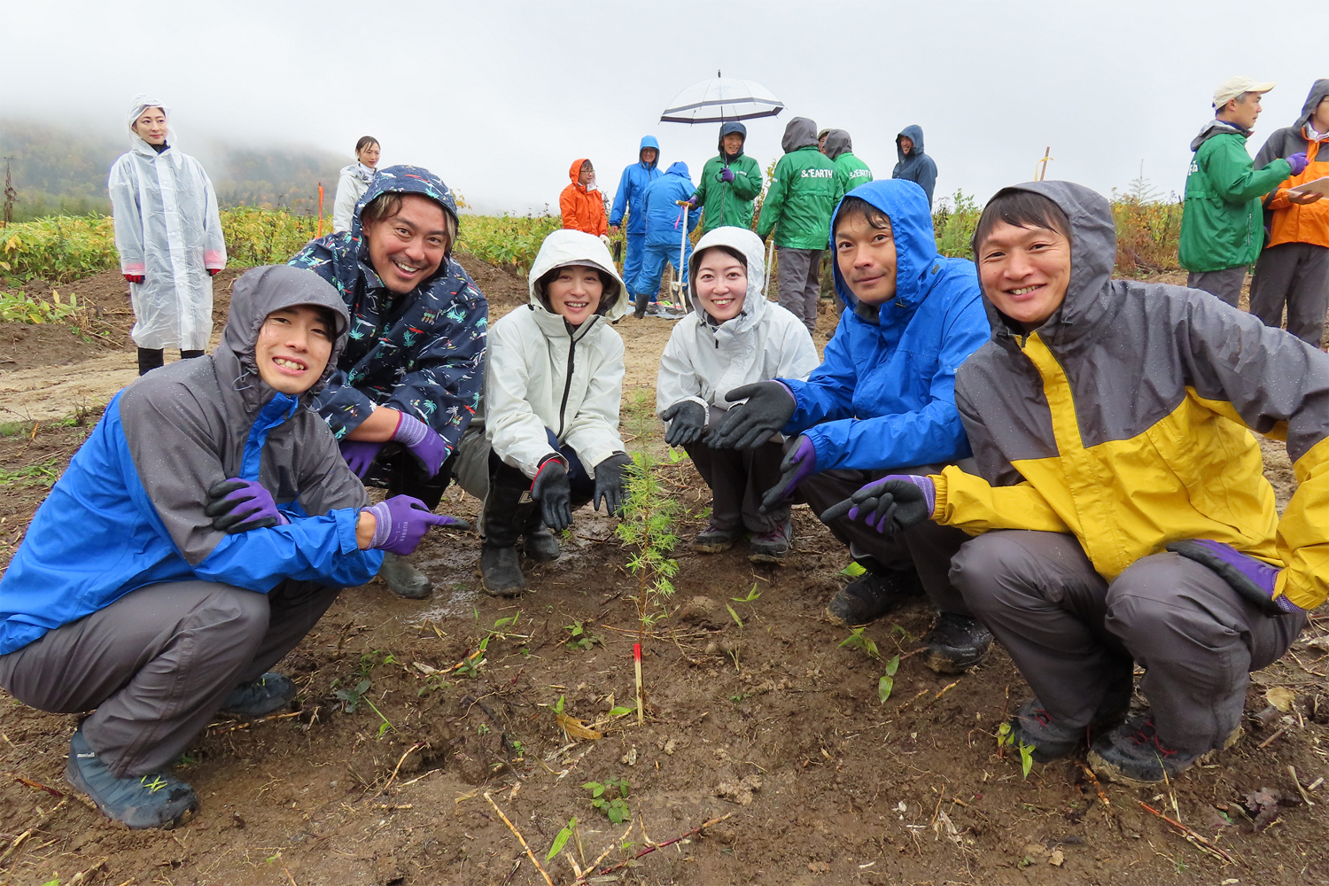 Digging the soil and planting saplings. This small, young tree will become part of one of Hokkaido’s forests of tomorrow. Despite the rainy weather, participants carefully dug the soil and planted the saplings.
