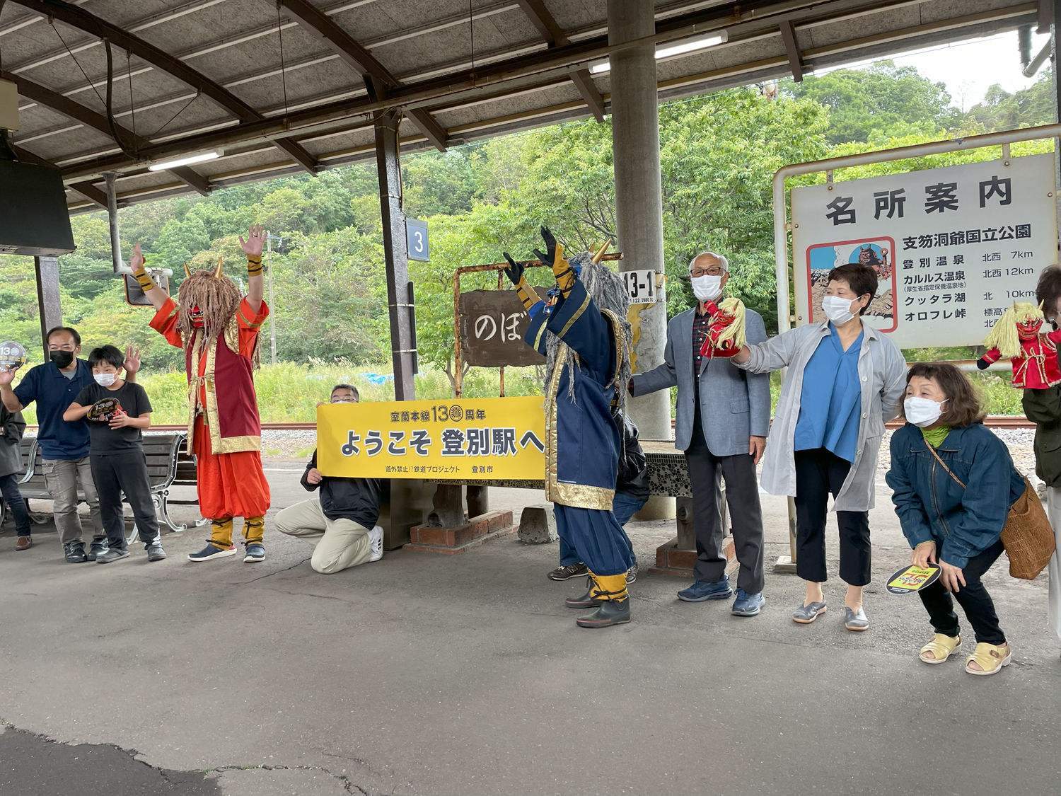 登別駅ではシンボルの鬼もお出迎えに参加(写真提供:「道外禁止!?」鉄道プロジェクト実行委員会)