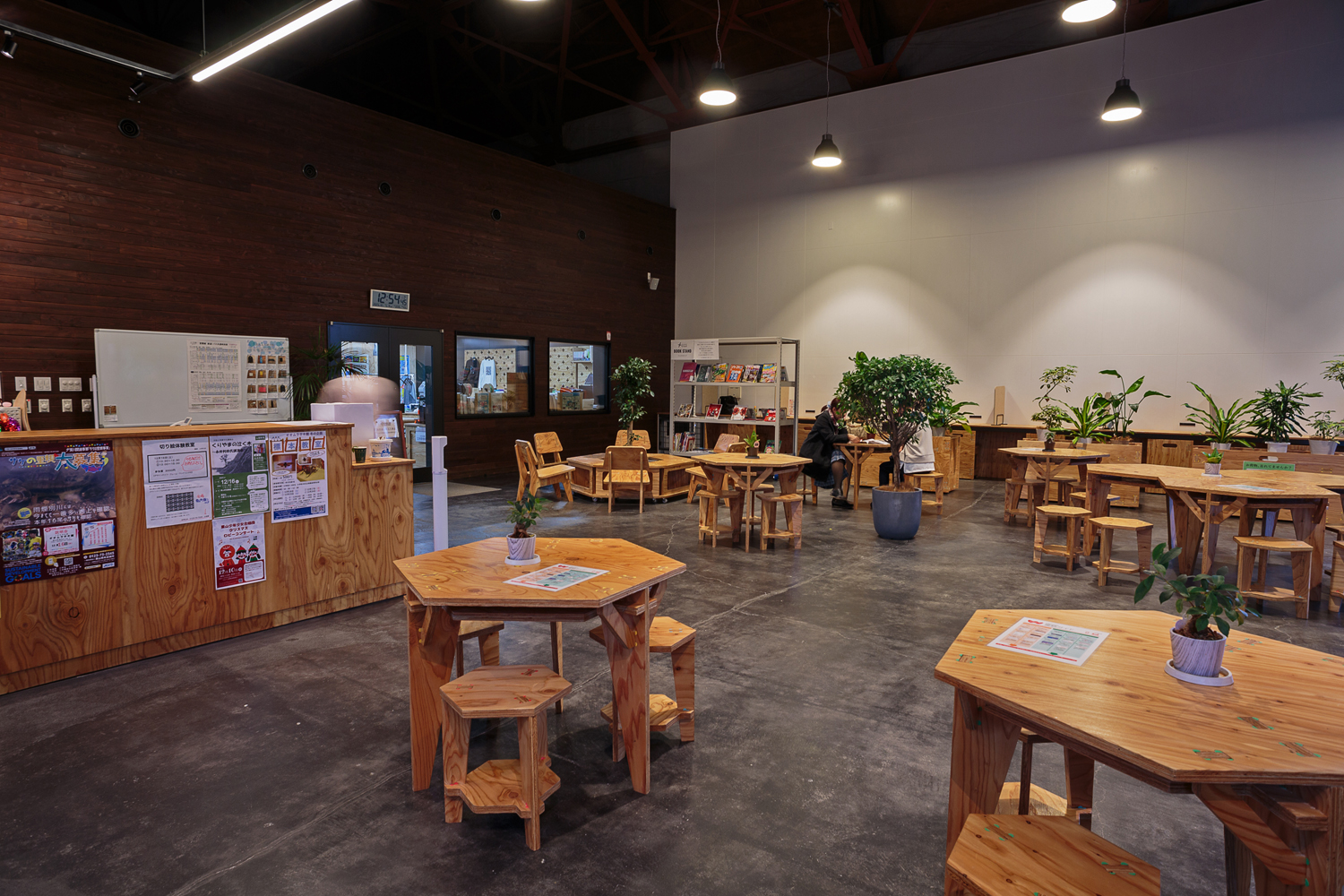休憩や歓談、飲食利用のほか、仕事や学習などのコワーキング利用もできる多目的ホール。六角形の椅子とテーブルは町民のべ70人が参加して「ファブラボ栗山」で作成した