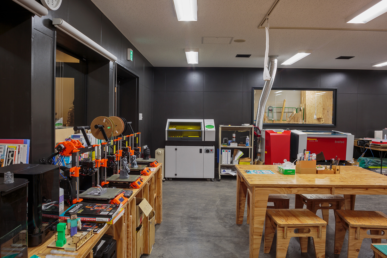 3DプリンターやUVプリンター、レーザー加工機などのデジタル工作機械のほか、各種ハンディツールや電子工作ツールなどがそろう「ファブラボ栗山」の工作室