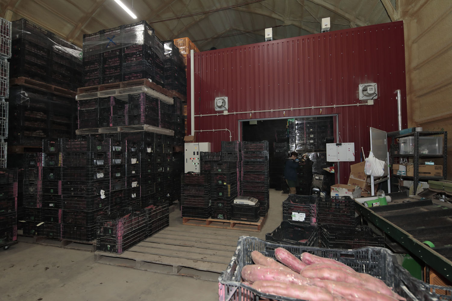 これは、「キュアリング」という貯蔵法のための専用施設。キュアリングとは「傷を治す」という意味で、収穫時にできるサツマイモの傷から病原菌が侵入しないよう、ある条件下に3日間程度置くことで傷をかさぶたのようにコルク化させ、腐敗を防ぐことを指す。条件とは「温度30~40度・湿度90%以上」。先の倉庫は、その特殊環境を人為的に作り出す施設なのだ。キュアリングは品質保持や長期保管に有効な上、追熟することで糖度が上がり、甘みが増すメリットもある。これでお分かりだと思うが、ネーミングの由来二つ目は「“ゆっくり”時間を掛けて熟成させる」ことである。