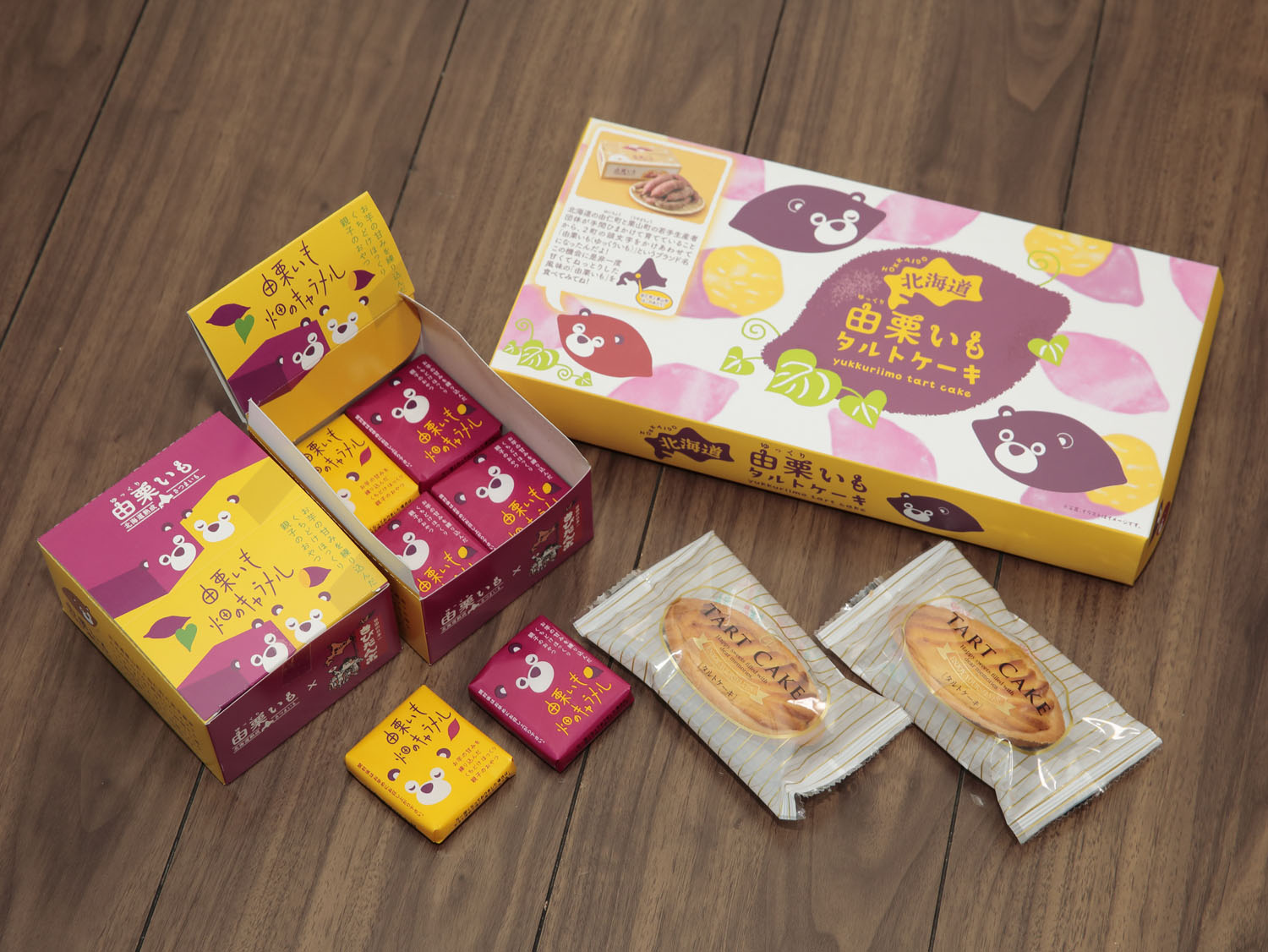 左が「由栗いも 畑のキャラメル」。右は「由栗いも」のペーストを使ったタルトケーキで、どちらも「そらち南さつまいもクラブ」が立ち上げた合同会社ベジタボが直販。ほかにも、地元飲食店が「由栗いも」メニューを考案する事例も増えている