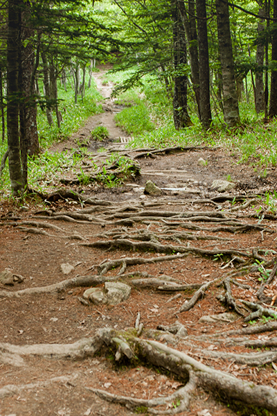 登山道を這うように伸びる木の根。かんらん岩は硬いため土になりにくく、土壌が薄いので根を深く張ることができない