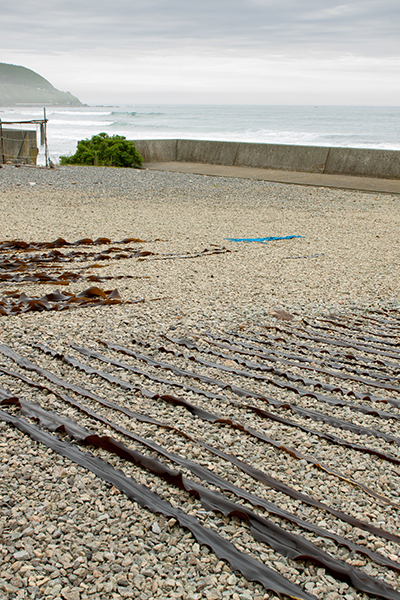 現在の様似では、コンブ干場にかんらん岩のかけらを敷いている。コンブ干しをしていた漁師さんは、「前は玉砂利を使っていたけれど、かんらん岩は重くてコンブにくっつかないからいい。風通しもいいしね」と話す。コンブは1日で干さないと、白っぽくなり評価が下がってしまうので、乾きの良さは重要だとか。「地元のかんらん岩を使ってるんだよ。知ってるかい、アポイ岳の」と誇らしげに言い、切り揃えて出たコンブの端っこをたくさん持たせてくれた。