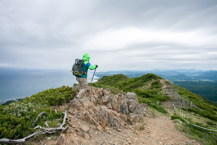アポイ岳8合目付近「馬の背」から様似市街方向をのぞむ。かんらん岩のほか、海からの霧や強風が山に特殊な植物相をもたらした