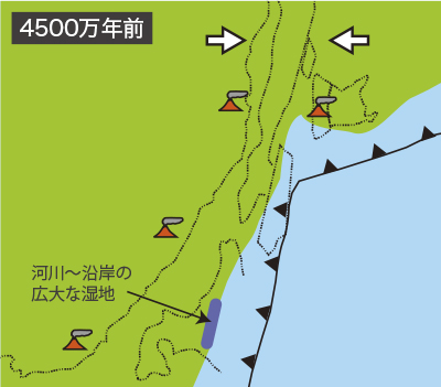 プレートの動きによって北海道の大地はしだいに近づいていく。陸地には広大な湿地に、のちの石炭を生み出す森林が広がっている。