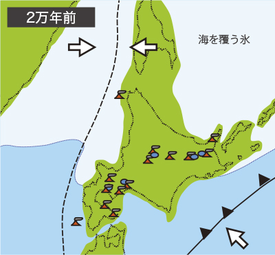 その後、地球はだんだん寒くなり、厳しい寒冷期(氷期)とやや暖かい時期(間氷期)を繰り返すようになる。山に降った雪はそのままとけずに残り、一部は氷河となって日高山脈など高い山を削っていった。陸地に降った雪が融けなくなったことで海面は大きく下がり、陸続きとなった大陸からはマンモスやオオツノジカ、ナウマン象などの動物、そして彼らを追いかけて人類もやってきた。