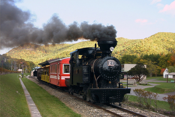 1928(昭和3)〜1958(昭和33)年、丸瀬布で木材の運搬に活躍した国産初の11トン機関車「雨宮21号」が、住民有志の尽力により動態保存され、北海道遺産にも選定。4月下旬から10月下旬の土・日・祝日は、「森林公園いこいの森」園内2kmの軌道を周遊(夏休み中は毎日運行)。