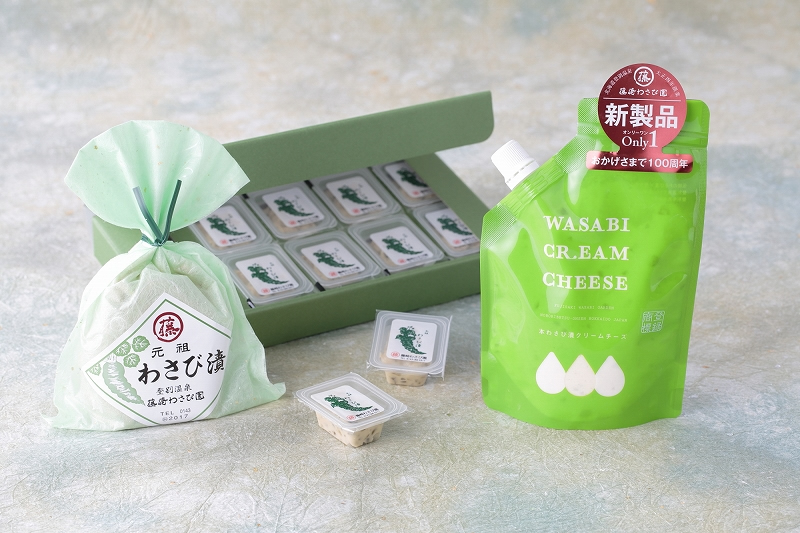 きんちゃく入りわさび漬(140g・648円)、食べきりサイズわさび漬(10g×10個・1080円)、本わさび漬クリームチーズ(150g・1080円)。価格は税込
