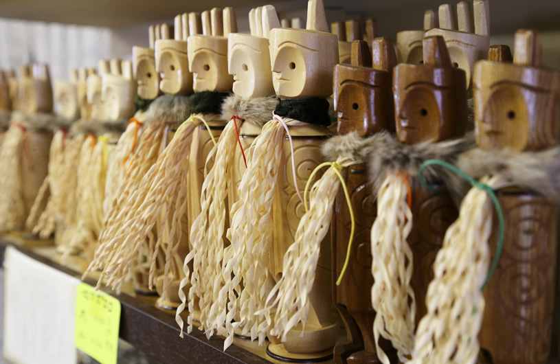 「セワポロロ」は大・小・特小・ミニの4タイプ(400円〜2000円)。クルミ、シナ、エンジュ、イチイなどすべて道産材を使用。首に巻く毛皮は、昔はアザラシやミンクだったが、今はフェイクファー。朔峰さんが作った木偶もまだ残っている(※2016年9月末現在)