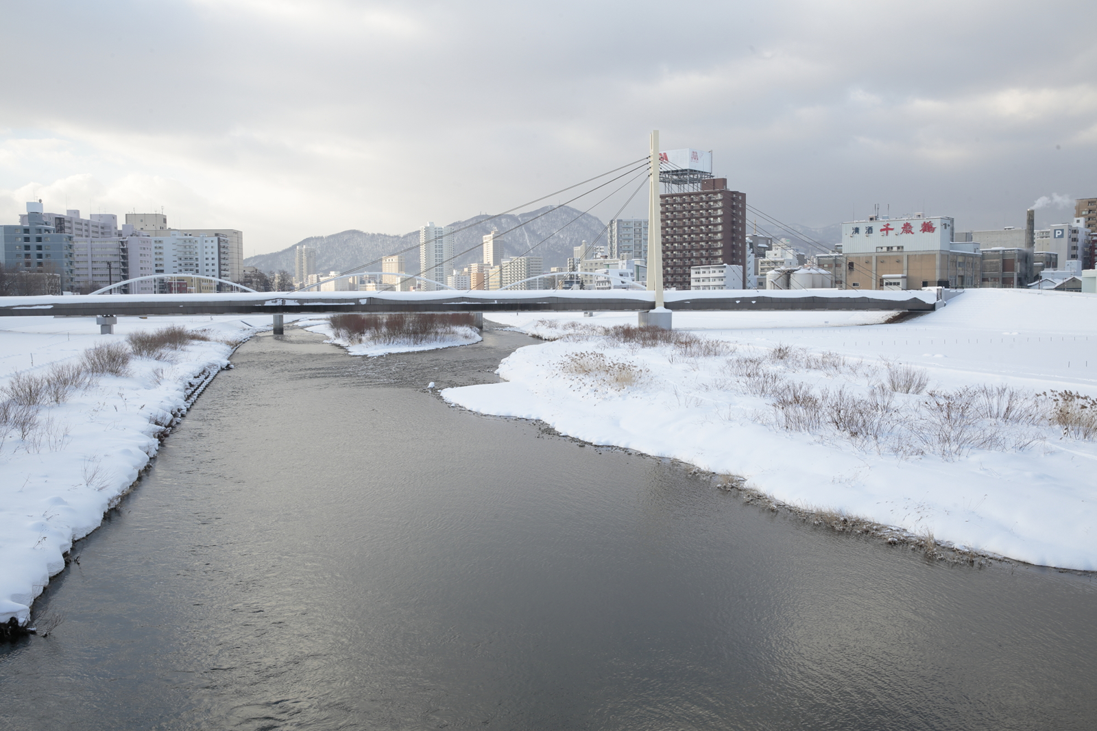 札幌市中心部を貫く豊平川。右に見えるのが日本清酒の本社と醸造所、遠くは手稲の山なみ