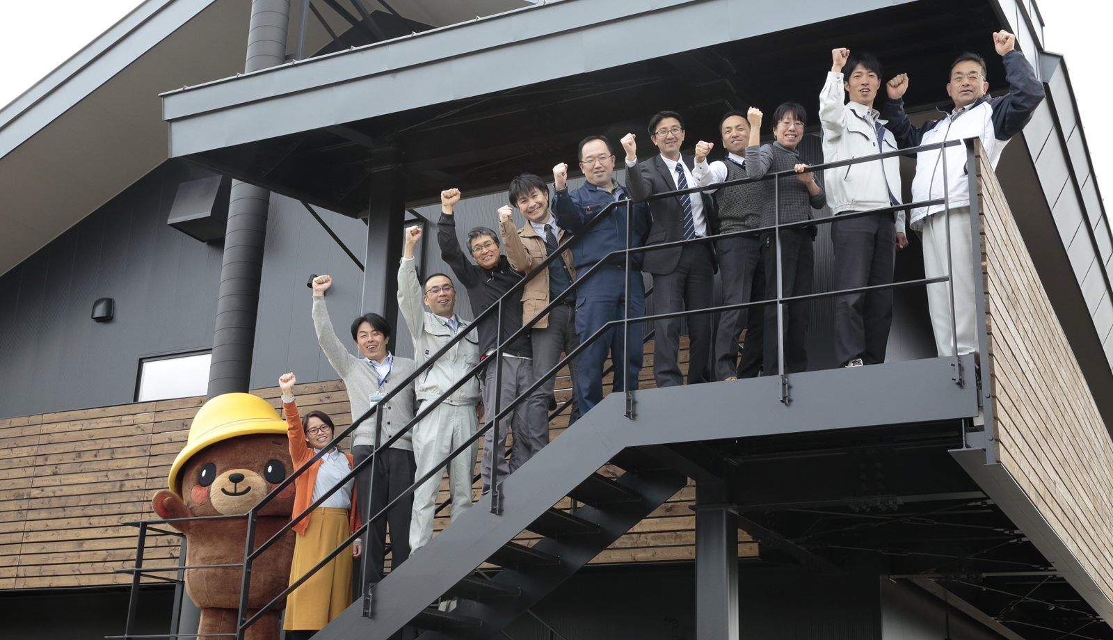 川端杜氏を囲む「酒蔵支え TaI」の皆さん。上川町のマスコットキャラクター「かみっきー」も駆け付けてくれた