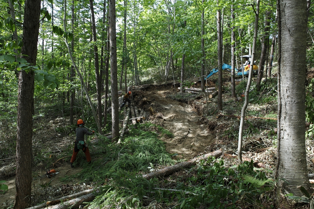 できたてほやほやの、気持ちのいい道。道の表面は、外から砂利を持ってきたりせず、その場の土や砂を使って整える。また、現場で出た木の根やクマザサの根で路肩が崩れるのを防ぐ。こうした工法は、滋賀県の田邊由喜男さんが提唱する「田邊式」を基本としている