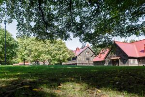 南北に細長い北海道大学の敷地の北部に位置する、「札幌農学校第2農場」。樹齢150年を越すハルニレの木々を従え、明治時代に造られた畜舎などが保管されている。芝生でお弁当を広げる人も多く、実に気持ちのよい空間だ。「北海道畜産発祥の地」といわれる歴史の舞台を歩いてみよう。