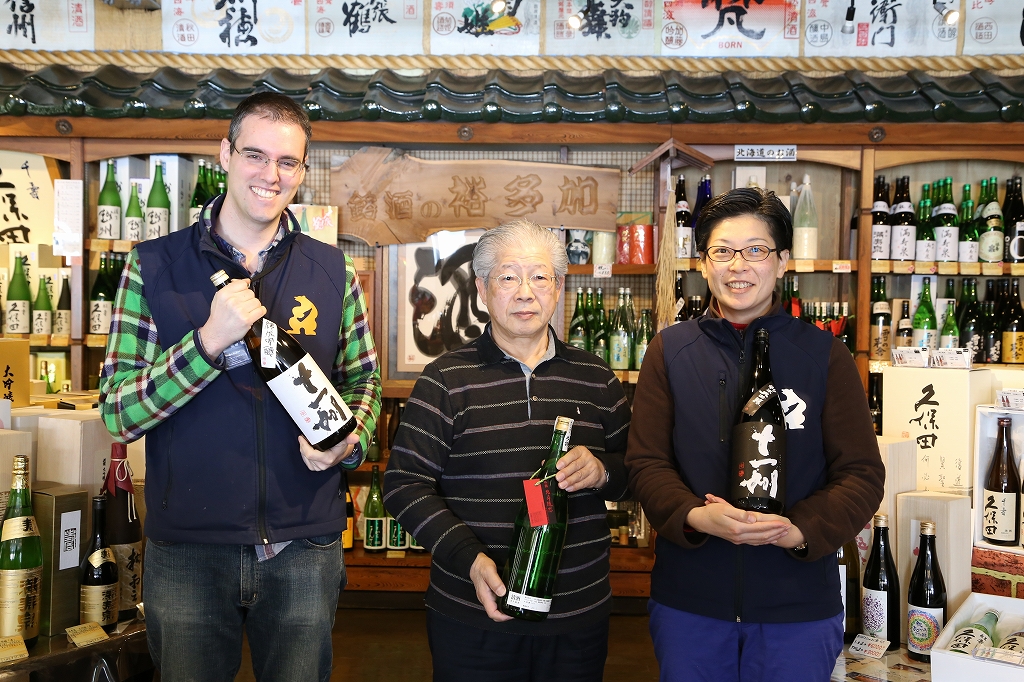 札幌市北区の酒屋「銘酒の裕多加」にて。右から、熊田理恵さん、熊田裕一社長。そして左の人物は…(答えは記事の中に)。