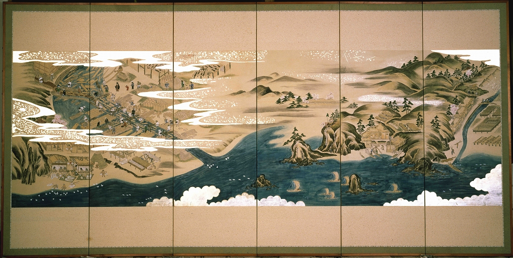 「松前桧山屏風 乾(模写)」。1隻6曲屏風に18世紀の江差の山仕事が描かれている。中央の厚沢部川では流送が行われている(函館市中央図書館所蔵)