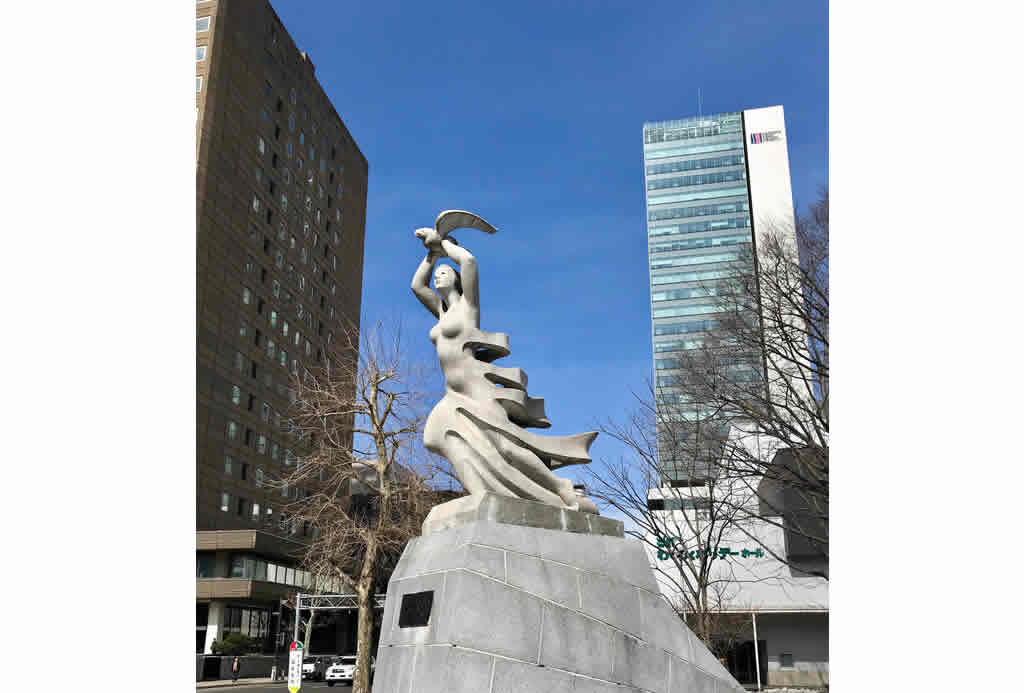 「希望」の制作には、大通公園をはさんだ老舗百貨店丸井今井の大きな支援があった。台座のプレートにその名が記されていないのは、売名行為を良しとしない創業者由来の社風に依るものだという。
