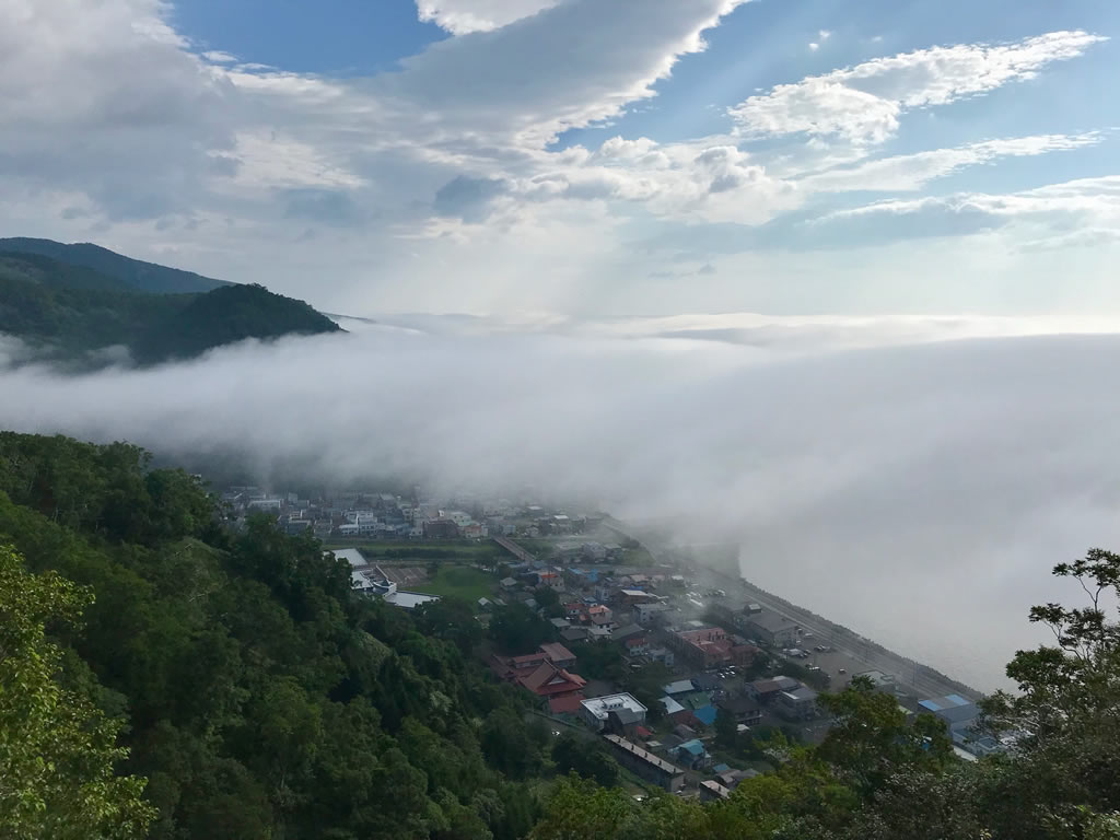 夏の羅臼国後展望塔からの風景。千島列島は霧のかなた
