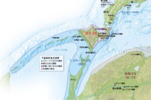 大陸側から日本海を見ると、日本史の風景が一変するだろう。内海としての日本海につながったオホーツク海を含めれば、巨大なアムール川の存在と、南北を往来する人々の動きが、千年のスケールで想像できるような気がする。北海道を、境界と接触の領域に浮かぶ島として位置づけてみよう。