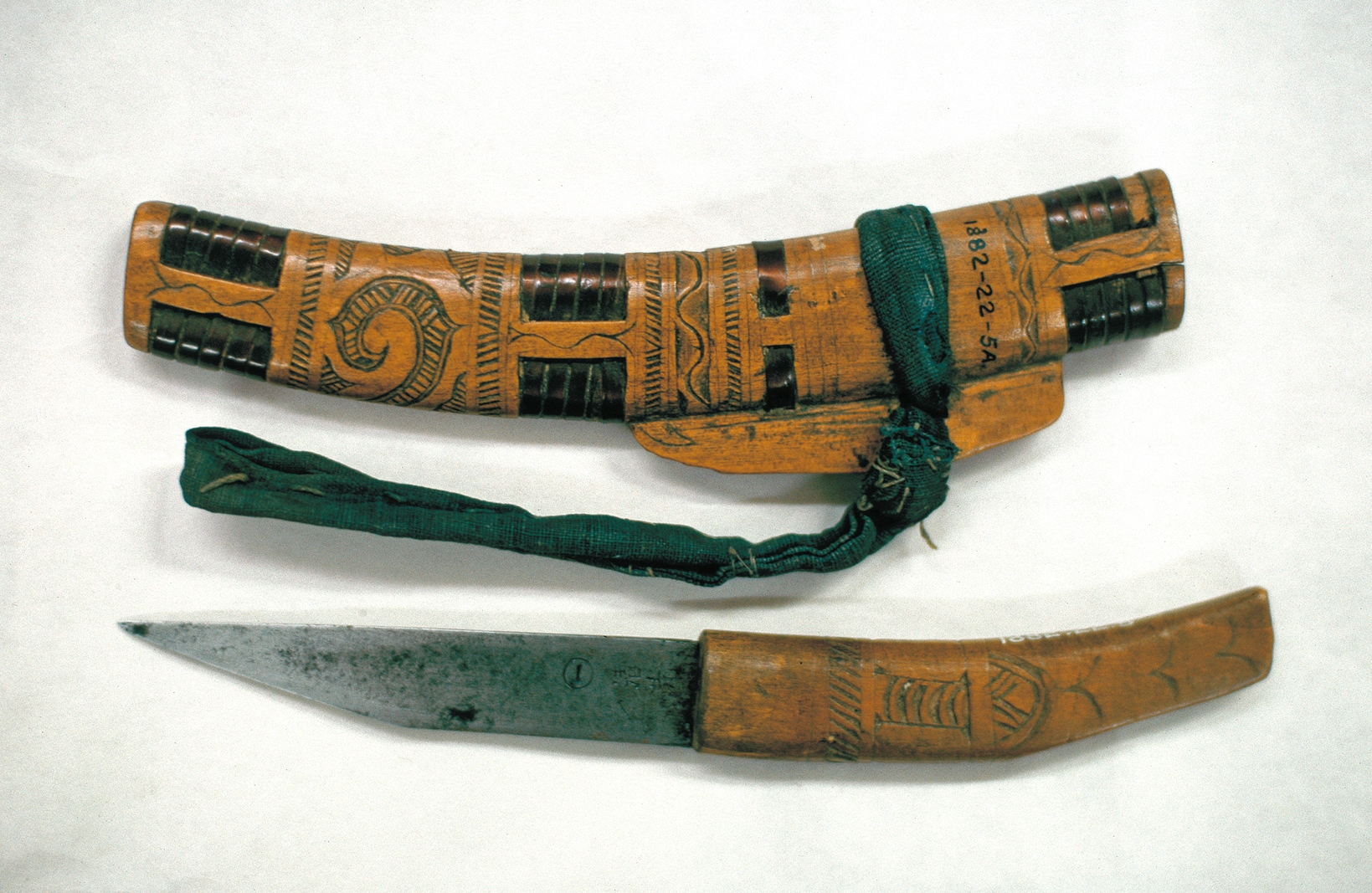 この写真のマキリを、私は、イザベラ・バードが日本から持ち帰ったモノ7点の1つとしてエディンバラの国立スコットランド博物館に所蔵されていることを2006年に発見し、私の世界巡回写真展で展示し、その記念出版物である写真集に掲載した。素朴な中に製作者の感性の鋭さが感じられ、生活用具としての水準の高さに驚く。だがこのマキリの価値は、バードの旅そしてその記録とみごとに結びつくことによって、単なる工芸品としての価値を超える点にこそある。このマキリこそは、「弓[ク]を一つ、毒矢を三本、蒲[シキナ]を編んだ茣蓙[トマ]を二枚、鞘付きの小刀[マキリ]を数本、そして樹皮で作った着物を一つ買った」(金坂清則訳注『完訳日本奥地紀行3』p.89、「第41報(続)『アイヌのもてなし」)というバードの記述に見える数本のマキリの1つだと考えて間違いないからである。そしてこの記述によって、博物館に所蔵されるモノとしてのマキリが、それを超え、命あるものとして私たちの眼前に立現れてくるからである(※)