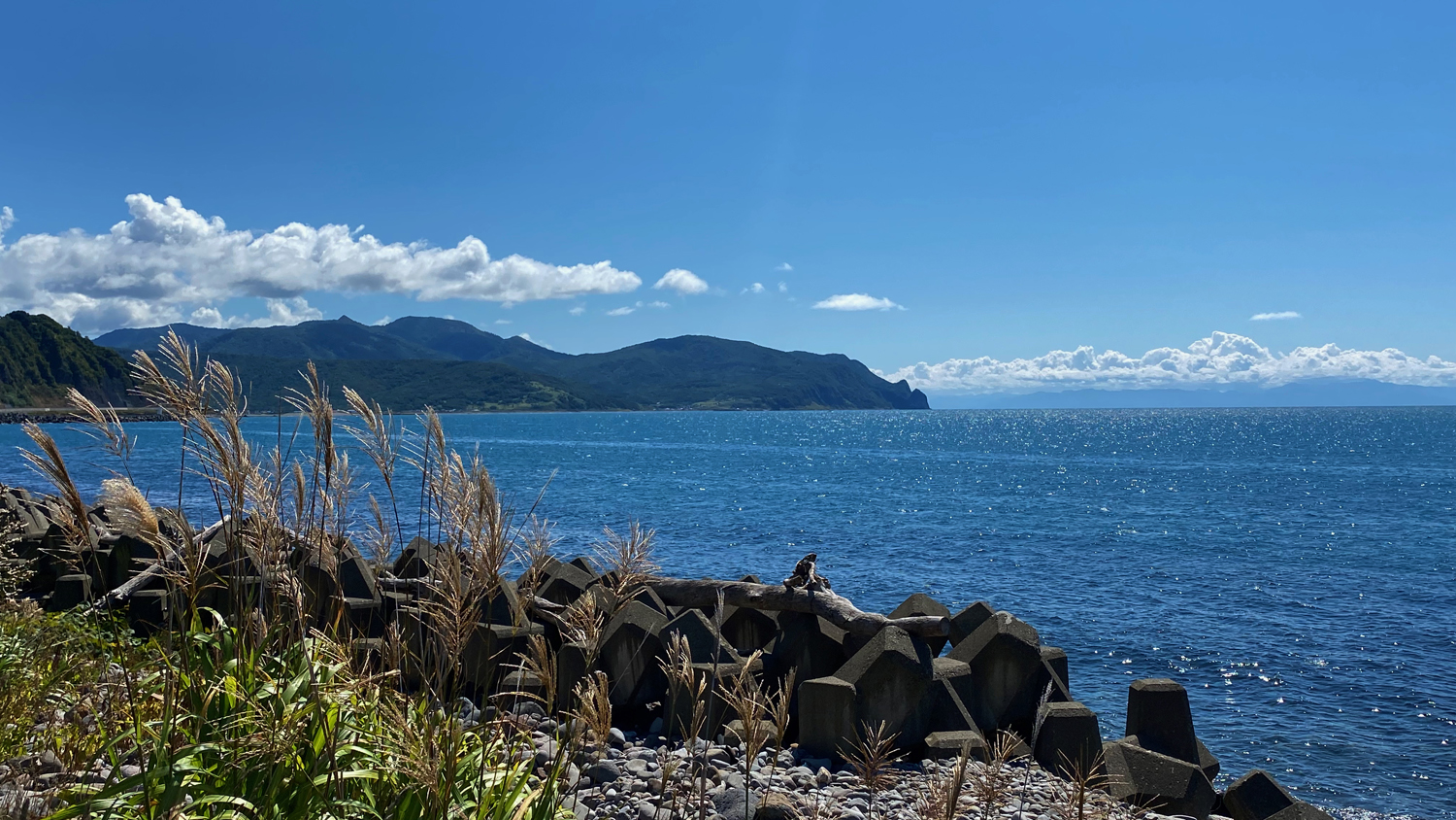 浜益(石狩市)から送毛の断崖を望む。その奥に石狩湾西岸の山並み