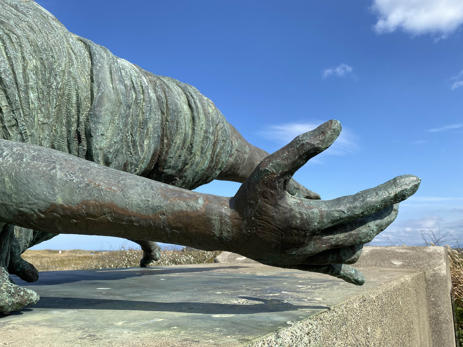石狩湾の中心、石狩川河口近くに据えられた、彫刻家本郷新の「無辜(むこ)の民」(一部)。題辞は、「この地に生きこの地に埋もれし数知れぬ無辜の民の霊に捧ぐ」