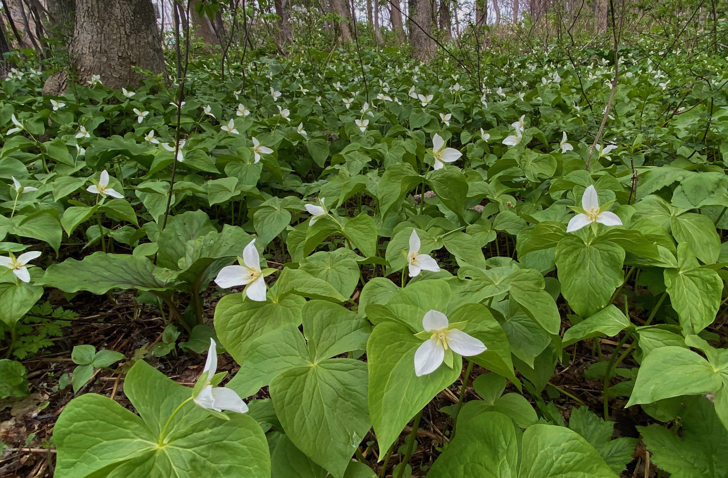 札幌北部の防風林の一画にある、地域の人々に愛されてきたオオバナノエンレイソウの群落(2021年5月)