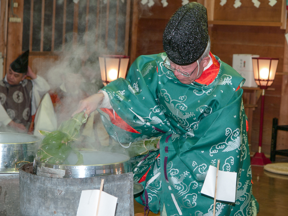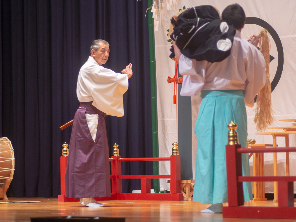 真剣で四方の注連縄を切り祓う「注連祓舞(しめはらいまい)」
