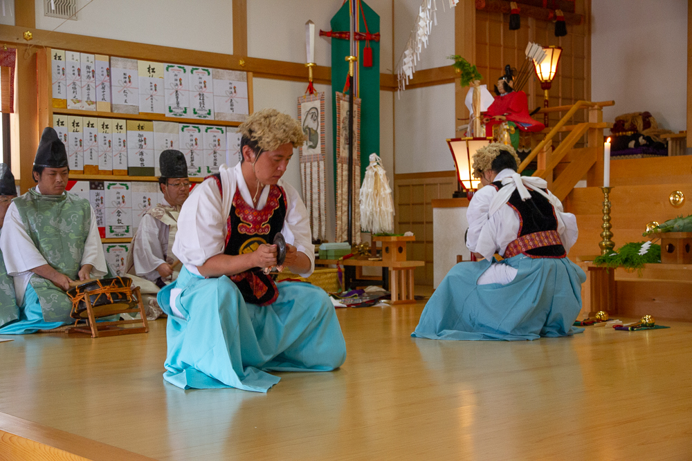 毎年6月中頃から、道南地方では祭りが始まります。厳粛の中、拝殿の中で行われる神事の最後に行われる神楽が「松前神楽」です。
