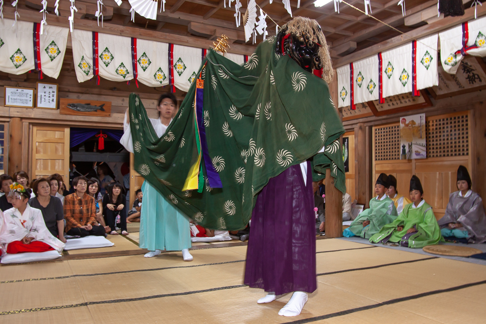 1カ所の神社では見ることが難しいので、他の神社の宵宮祭・本祭に足を運ぶことになりますが、それでも確実に「鬼形舞」「十二の手獅子舞・御稜威舞、獅子の鈴上」に巡り合える保証はありません。ふとした拍子に舞うこともあり、舞い手次第、神社次第という、つまりはやはり運次第であり、数年間に渡る取材が必要になりました。