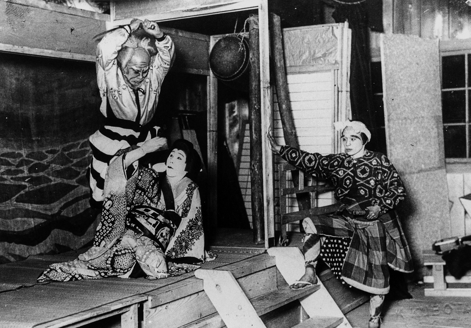 1934(昭和9)年、篠路歌舞伎最後の公演の様子。写真の演目は「神霊矢口渡」で、左が座長の「花岡義信」こと大沼三四郎