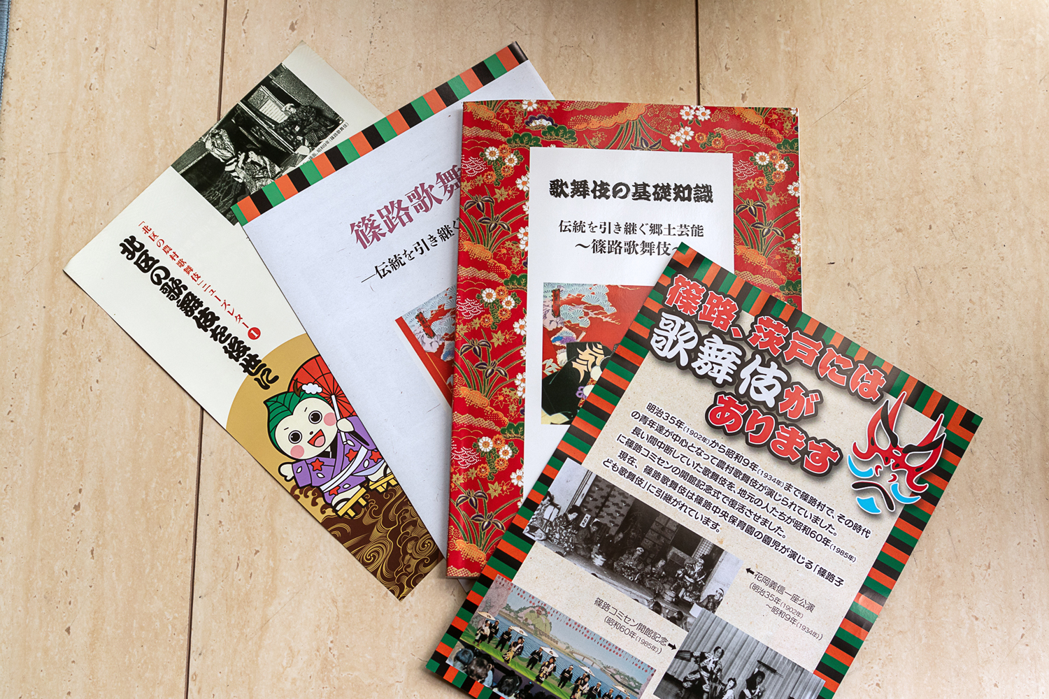 篠路歌舞伎保存会が作成した配布物。最新版は「歌舞伎の基礎知識」(右から2冊目)で、コロナで講演活動ができなくなった昨年春から10カ月かけ、歌舞伎の基礎的な事柄や篠路歌舞伎の歴史などを冊子にまとめ、会員に配った