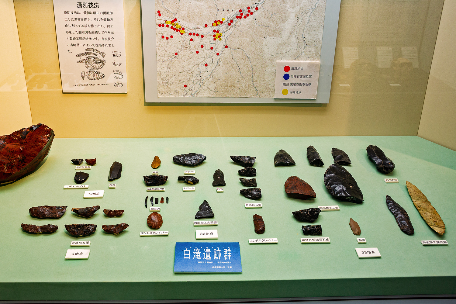 話題の「白滝遺跡群」コーナー。湧別技法の解説パネルも設置されている