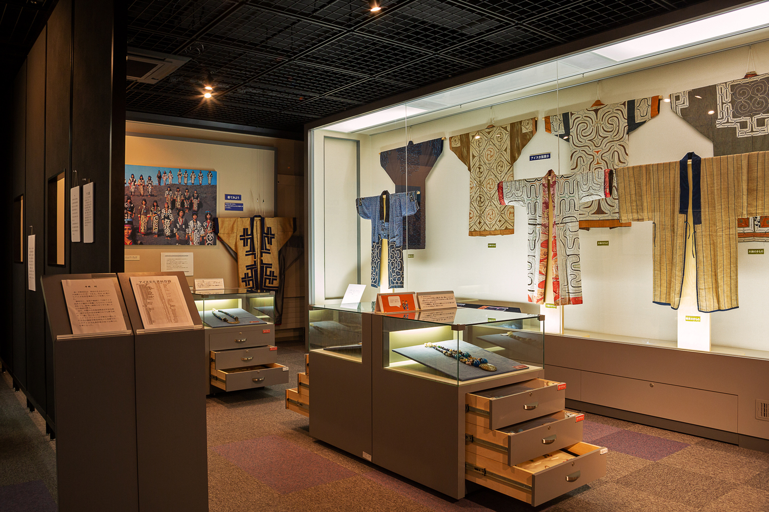 「平野コレクション」の展示。左端下の青い服は、サッポロビールの星マークがプリントされた浴衣の生地が使われている珍しいもの。明治時代にすすきのの花柳界で販促用に配られたものだが、どのようにアイヌの人の手に渡ったのかは分かっていない