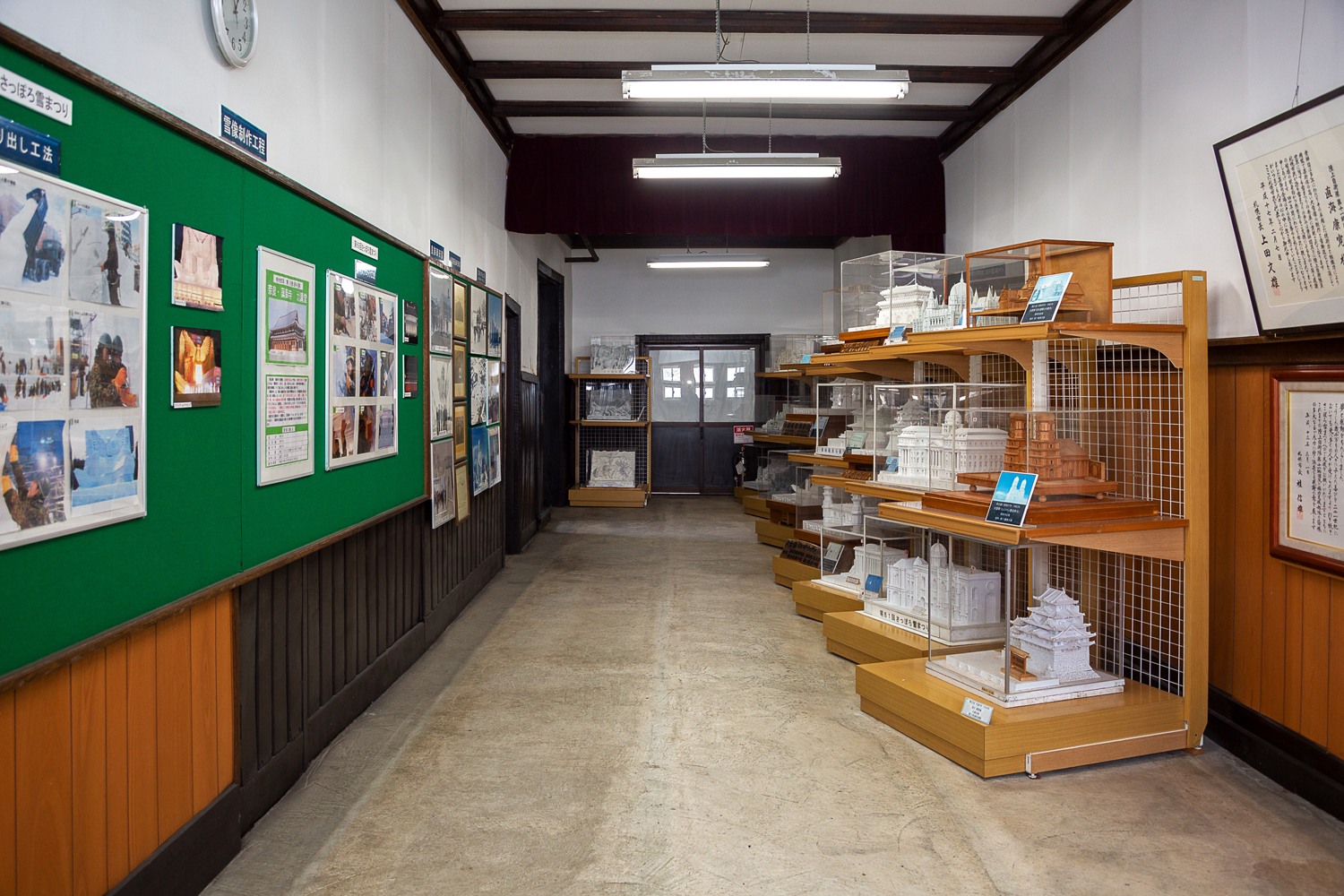 今も続く雪像制作の舞台裏もパネルで紹介。時代を反映した歴代の雪像模型を見るのも楽しい