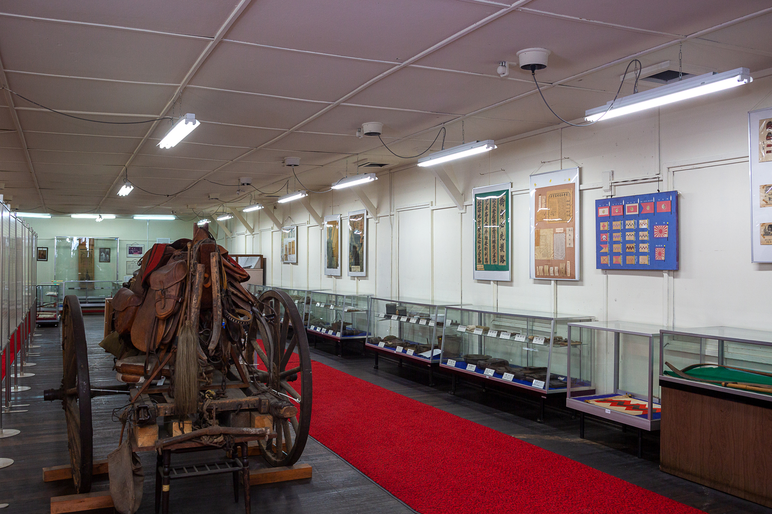 当時の弾薬車(左)をはじめ、さまざまな旧軍の史料が並ぶ3号館