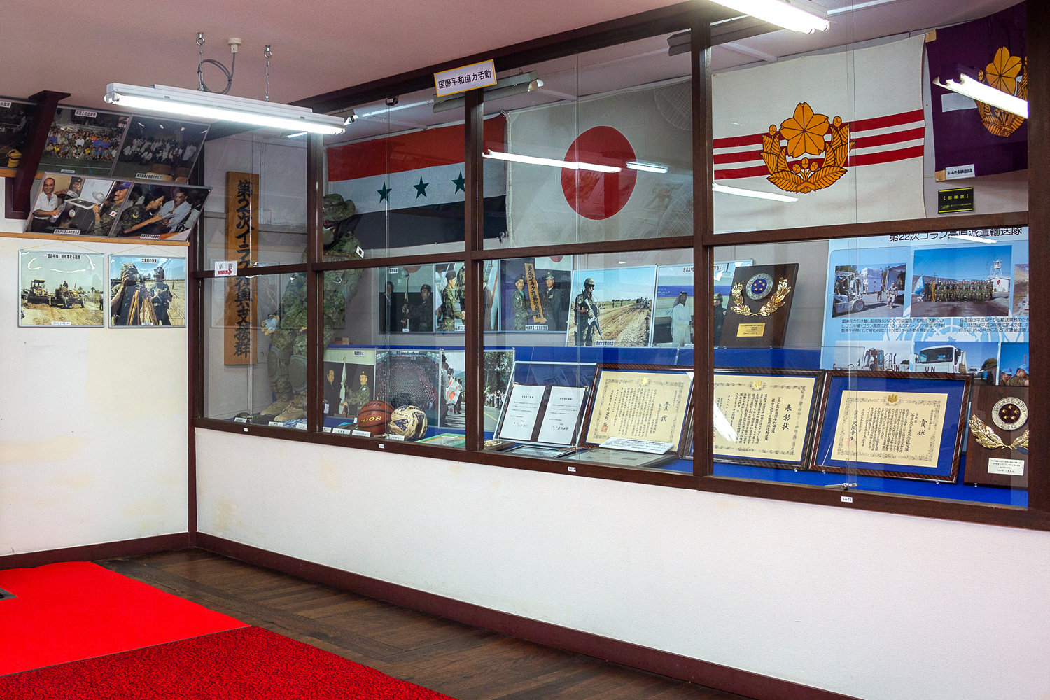 災害派遣や国際貢献活動を伝える1号館の展示コーナー