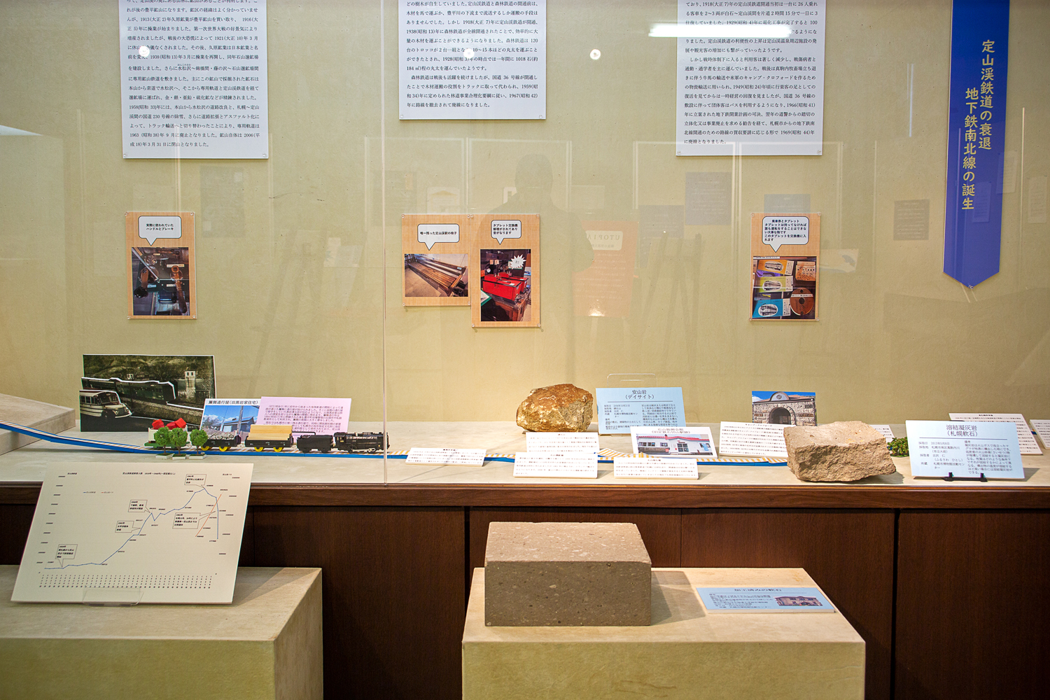 「定山渓鉄道から地下鉄南北線へ」では、定山渓鉄道で運搬され建材としてリンゴ倉庫にも使われた札幌軟石を展示し、産業テーマにつながるよう工夫した