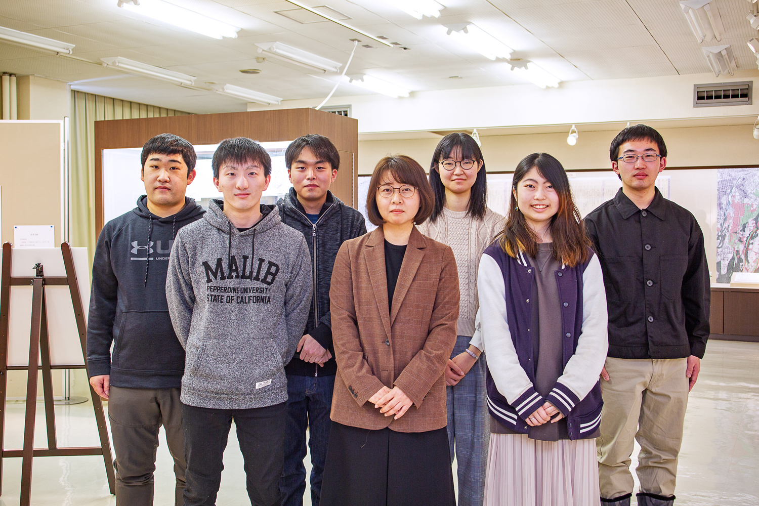 松友教授(前列中央)と、企画展を手掛けた学芸員課程の地域共創学群 歴史文化専攻の学生たち。(前列右から)村上さん、中村凱人(かいと)さん、(後列右から)前川さん、加藤さん、曽我さん、鳥居瑚太郎(こたろう)さん