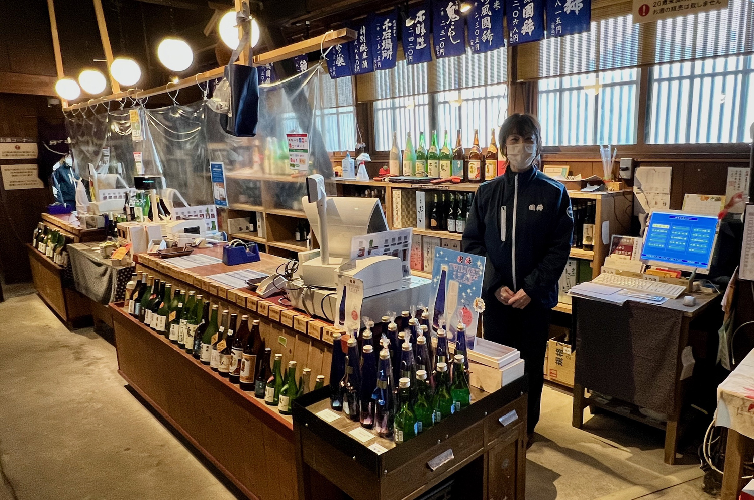 ここでしか買えない限定酒も人気のショップと、企画室長の本間櫻さん。カウンターは、酒搾りに使用していた槽(ふね)の材を活用している