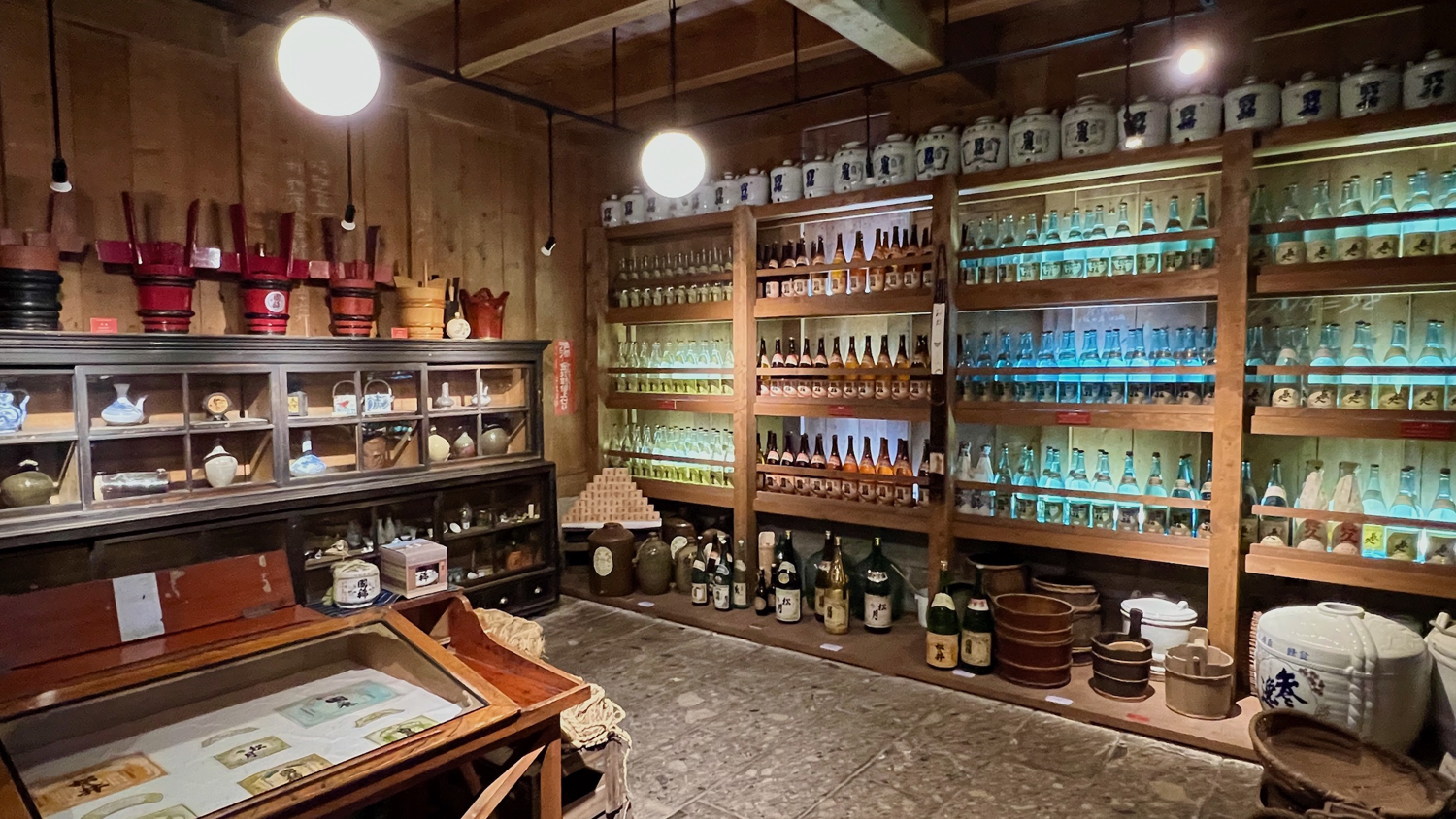 酒蔵の一角に設けられた、国稀酒造資料室。かつての道具や酒器、古いラベルが貼られた製品群が展示されている