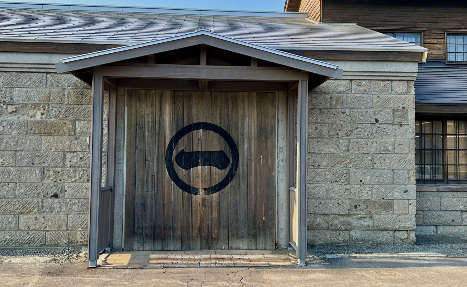 国稀酒造(株)の酒蔵の壁に印された「丸に一」のマークは、源流である「丸一本間」の屋号。高い志をなんとすっきりとあらわしたデザインだろう