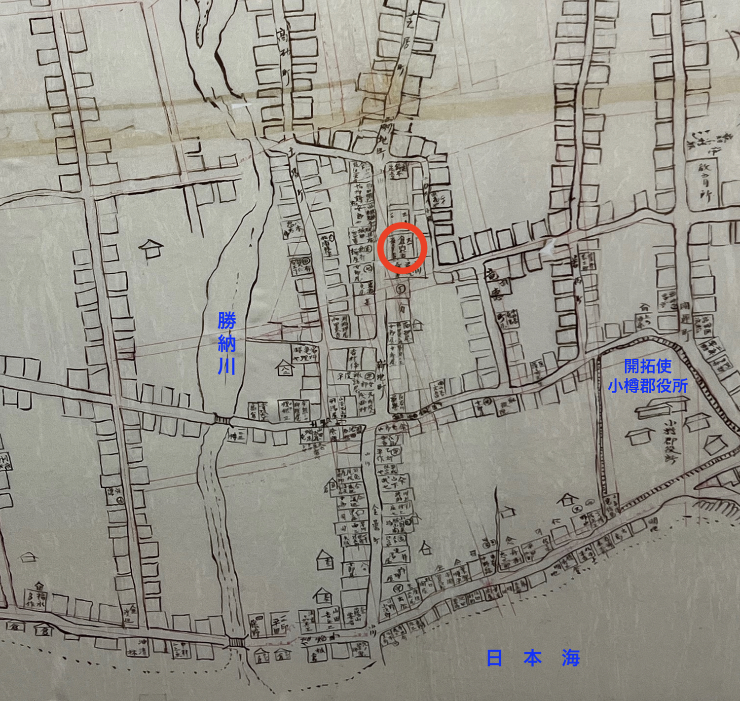 明治10年ころの小樽中心部を示す「小樽内概要図・模写」の一部に加筆。勝納川が上から下に流れ、中央に「倉内仁吉」の文字が見える。薄い赤線は現在の道路(地図:小樽市総合博物館・運河館所蔵)