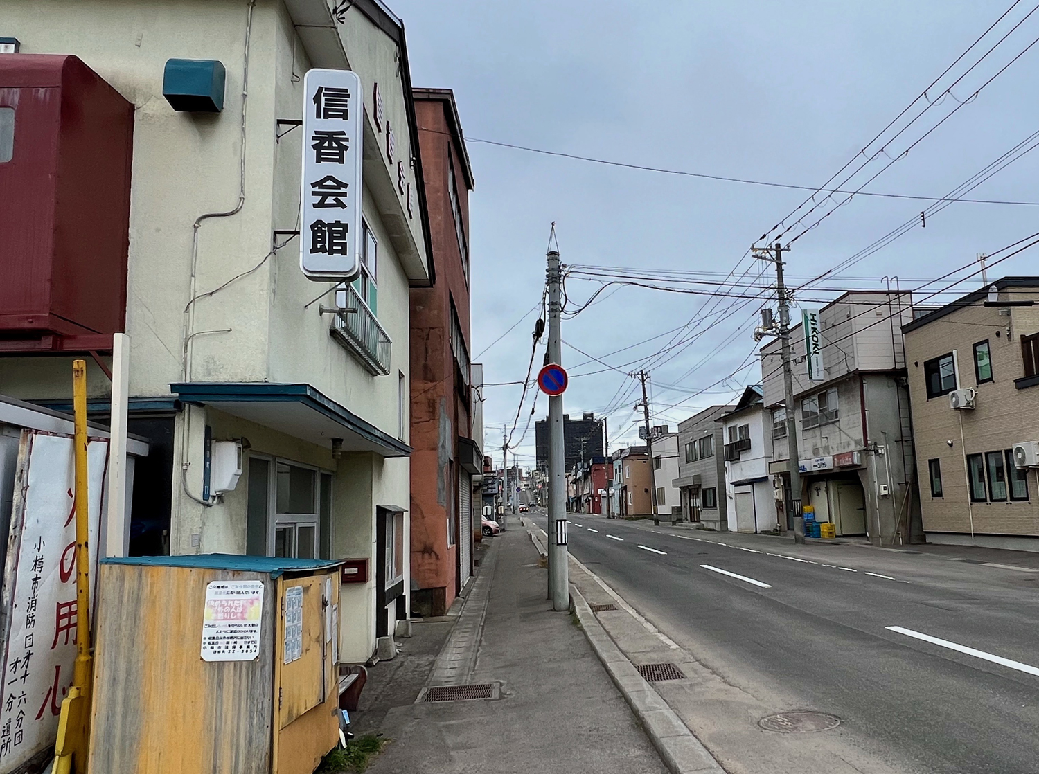 現在の小樽市信香町。勝納川を中心部に向かって渡る真栄橋の先に、地域の古くからの公共施設信香会館