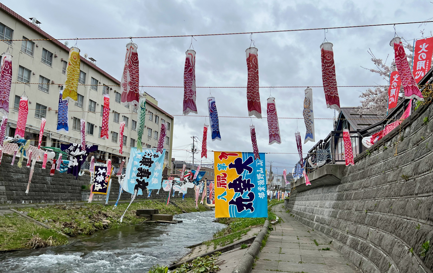 信香町の東端を下る勝納川。毎年4月の第2日曜日からひと月ほど鯉のぼりと大漁旗が飾られる